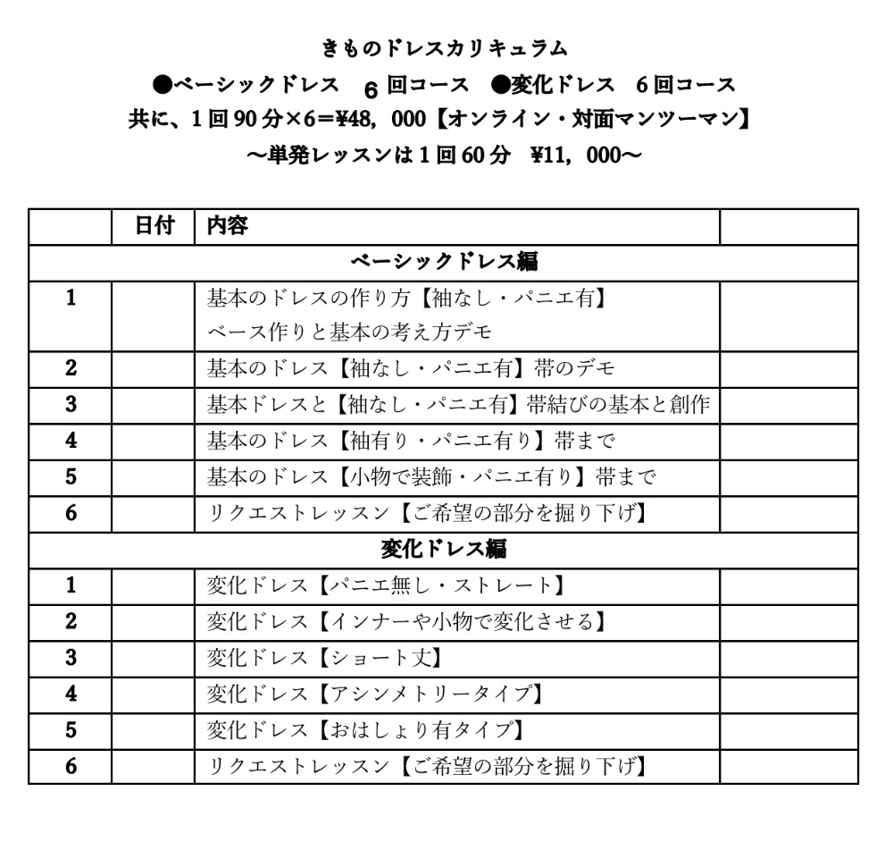 | 着物や振袖を切らずにドレス風に着付! ブライダルシーンや撮影会・イベントなどに活用したい方へ ●ベーシックドレス 6回コース ●変化ドレス6回コース 共に、1回90分✕6=¥48,000 【オンライン・対面マンツーマン】 〜単発レッスンは1回60分 ¥11,000~ |
